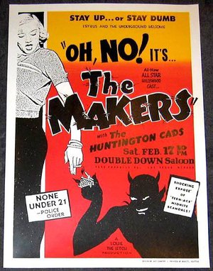 The Makers’ ferocious incarnation of primitive punk may have very well put Spokane on the map for garage rock enthusiasts in the early 90s. While the grunge infestation was nearing its climax west of the Cascades, the always dressed-to-kill Makers were on the eastern side of Washington state wailing away, celebrating the menacing elements of punk rock to both friends and enemies. The band’s immaculate channeling of sinister, no-frills R&B regularly incited both rambunctious dancing and drunken fights at shows.