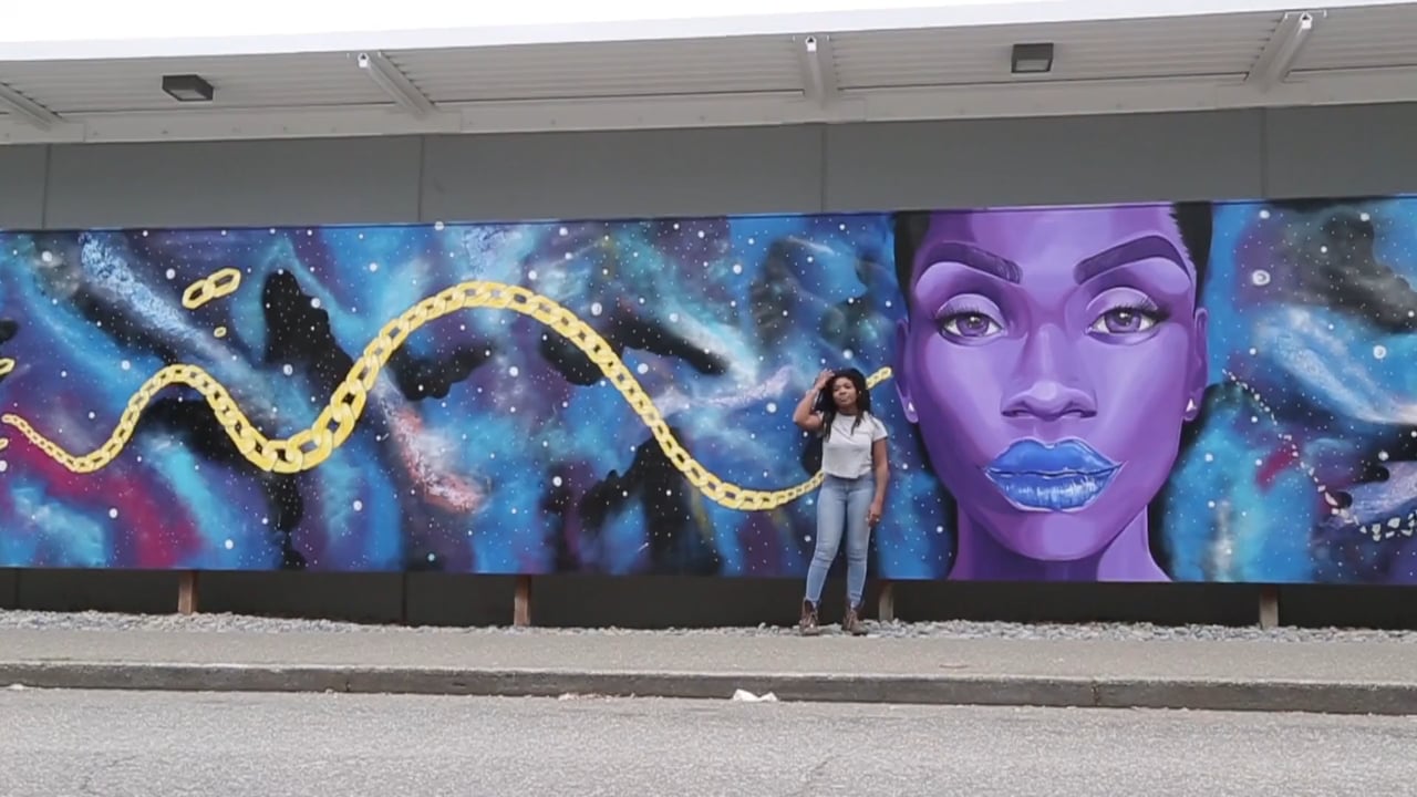 I want the future to look like freedom. And of course, that's a loaded word. I feel that everything that I stand for and everything that I do is around liberation and that's mentally, spiritually, physically, and all those aspects. So, freedom for women to be able to go the hospital or a doctor, and the doctors understand what's going on in their bodies. Freedom for artists to be able to be paid whatever they're worth. Black, white, purple, green, and, of course, I love painting purple people which was evident from the mural that I had painted for you all. And a photo that still sticks in my mind was, one of my friends had sent me a photo of her seven-year-old daughter, just standing in front the mural just with her hand on her hip, I mean, just like life. OK. She was feeling it, she was just feeling so proud to see this black woman represented in this royal purple who has the same wide nose as she does, who has the same large lips as she does. For me, it's about seeing every person exalted. Even when I say that, what disheartens me is that it feels like some sort of utopia. It sounds cliche in my mind like, "oh, we can all, like, love each other." But really though, I feel that that's 100 percent why we're here. To love one another, to learn from one another, and the only way you can learn is through differences.
