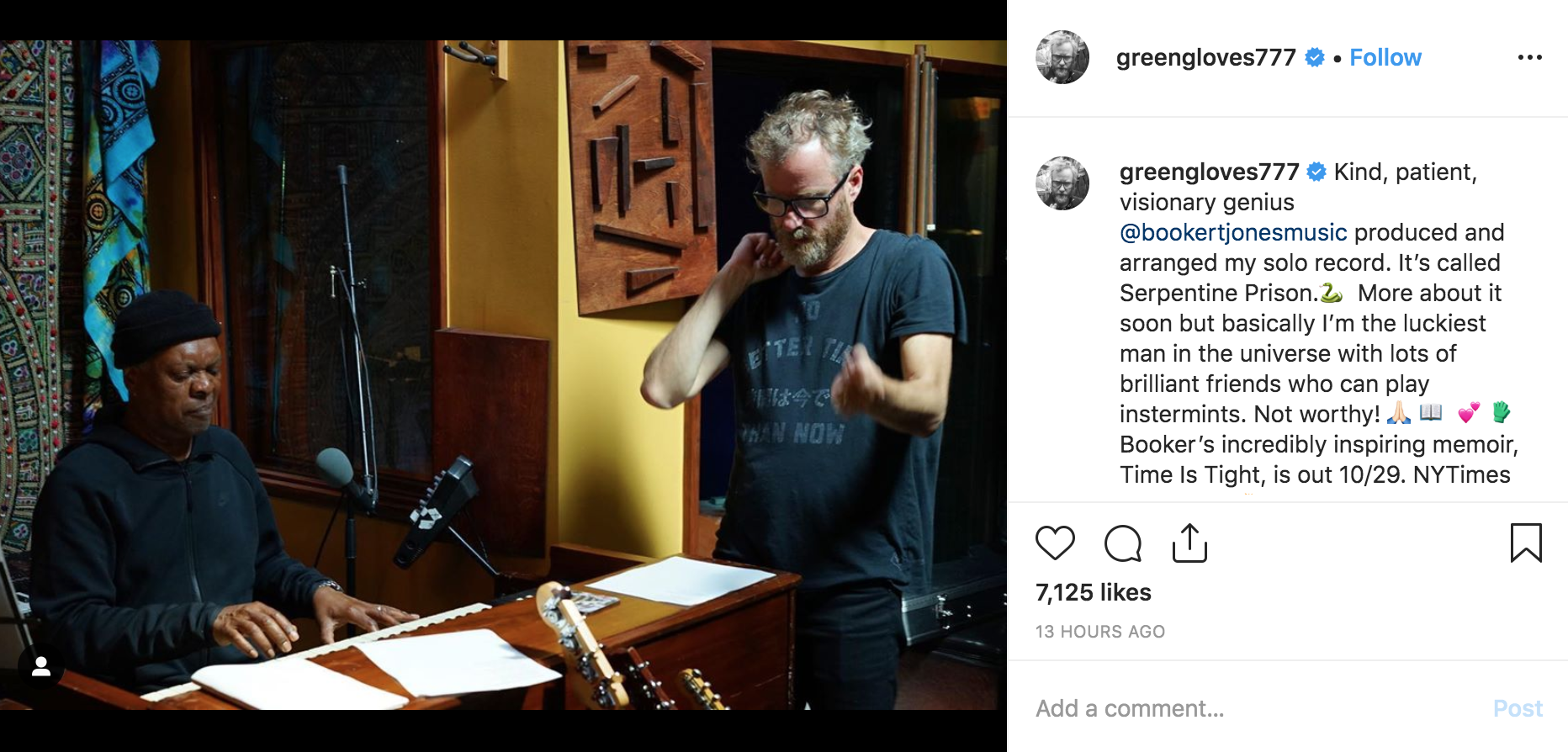 Berninger reveals on Instagram that the new album was produced and arranged by the legendary Booker T. Jones of Memphis soul group Booker T. & The M.G.s. In a photo caption, he writes “Kind, patient, visionary genius. Booker T. Jones produced and arranged my solo record. It’s called Serpentine Prison. More about it soon but basically I’m the luckiest man in the universe with lots of brilliant friends who can play instermints. Not worthy!”