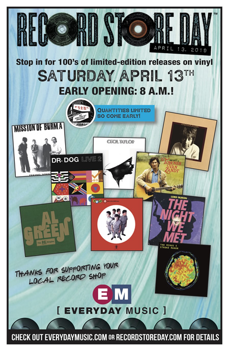 The store will have hundreds of exclusive in stock — many of them limited edition and all available on a first-come-first-serve basis (one copy per item per customer). And then from 2 PM 'til close, you can get 10% off all regularly priced new & used vinyl. (Does not apply to holds or reserve order items.)