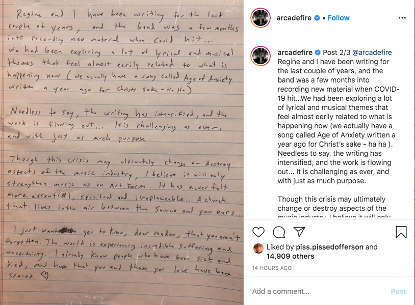 Though this crisis may ultimately change or destroy aspects of the music industry, I believe it will only strengthen music as an art form. It has never felt more essential, spiritual and irreplaceable...a church that lives in the air between the source and your ears... I just want you to know, dear reader, that you aren’t forgotten. The world is experiencing incredible suffering and uncertainty. I already know people who have been sick and died, and hope that you and those you love have been spared.