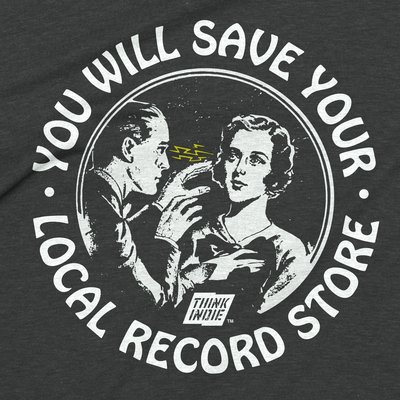 (And note: the image to the right is from a t-shirt that Dualtone Music Group — in partnership with ThinkIndie, Magnolia Record Club, and WEA/ADA Distribution — has released to help raise funds for independent record stores. 100% of the net proceeds from shirt sales will go back to independent retail. More info here.)