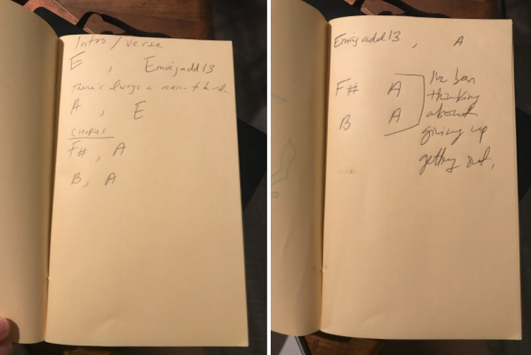 This is the beginning of "Always," which we just released earlier this month. It started with two chords and the line, “There’s always a reason to be sad.” Later at home, I went back and wrote in the start of what would become the chorus. A song can often change quite a bit from conception to finished product. The earliest stage of writing is very special to me. Magic!