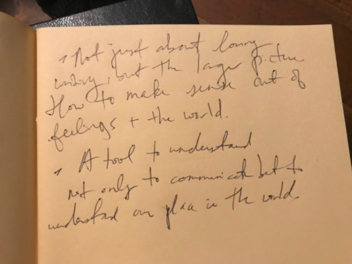 Here I am talking about writing again. I referred to it as “a tool to better understand our place in the world.” I like this sentiment because I think the best art doesn’t provide answers, it asks questions.