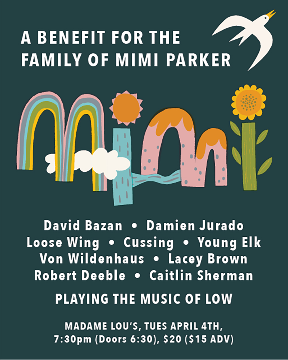 Hear all these covers and more on Tuesday, April 4th at Madame Lou’s, with David Bazan, Damien Jurado, Loose Wing, Cussing, Von Wildenhaus, Young Elk, Robert Deeble, Caitlin Sherman, and Lacey Brown. All proceeds to benefit the family of Mimi Parker. Tickets available here, and donations accenpted here.