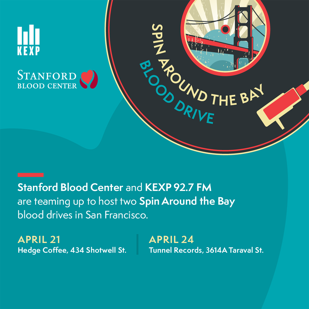 Stanford Blood Center and KEXP are teaming up to host two Blood Drives in San Francisco during KEXP’s Spin Around the Bay live Broadcast Week. On Tuesday, April 21st at Hedge Coffee at 434 Shotwell St in the Mission, and Friday, April 24th at Tunnel Records at 3614A Taraval St in Outer Sunset.