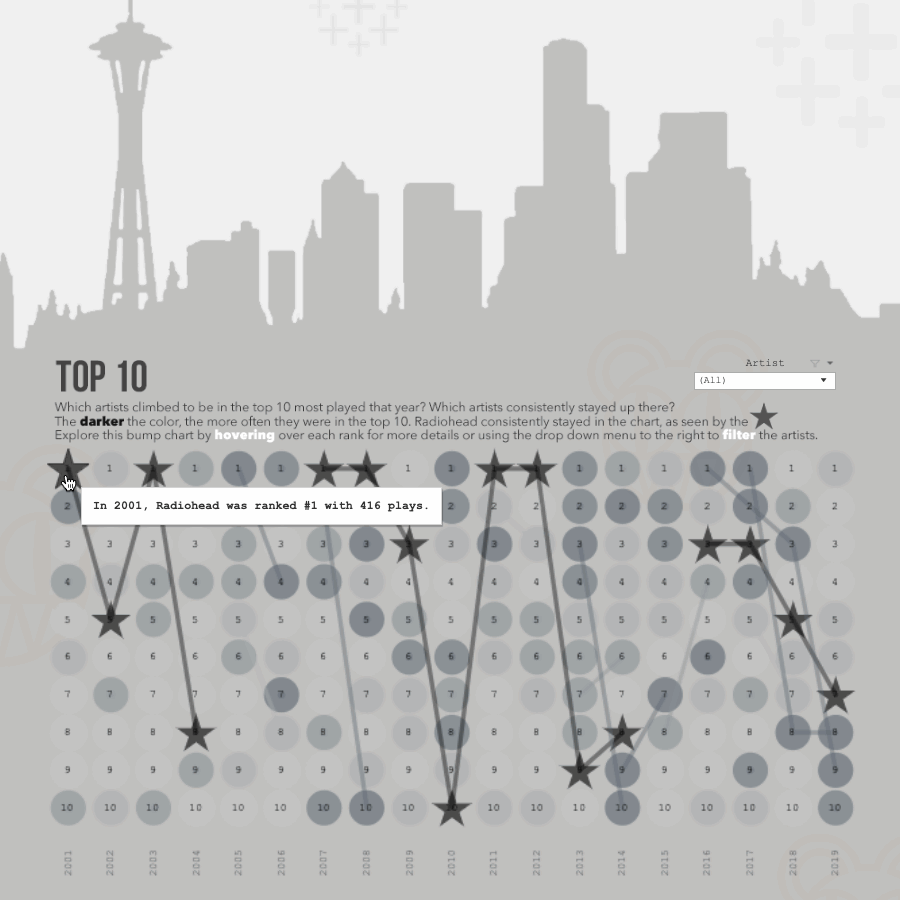 Dive into this viz to see KEXP trends over the last 18 years—from top song of the year to top artists.