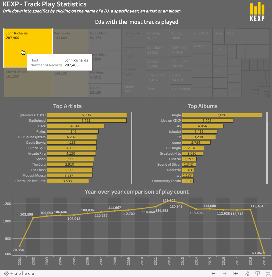 This incredible variety is reflected in our Playlist, a living record of every track played by KEXP DJs over the last 18 years. Our friends at Tableau recently compiled this data to answer burning questions like how much does KEXP play a particular artist? When are you most likely to hear Radiohead versus The Cure? Which DJ plays Jay Som the most?