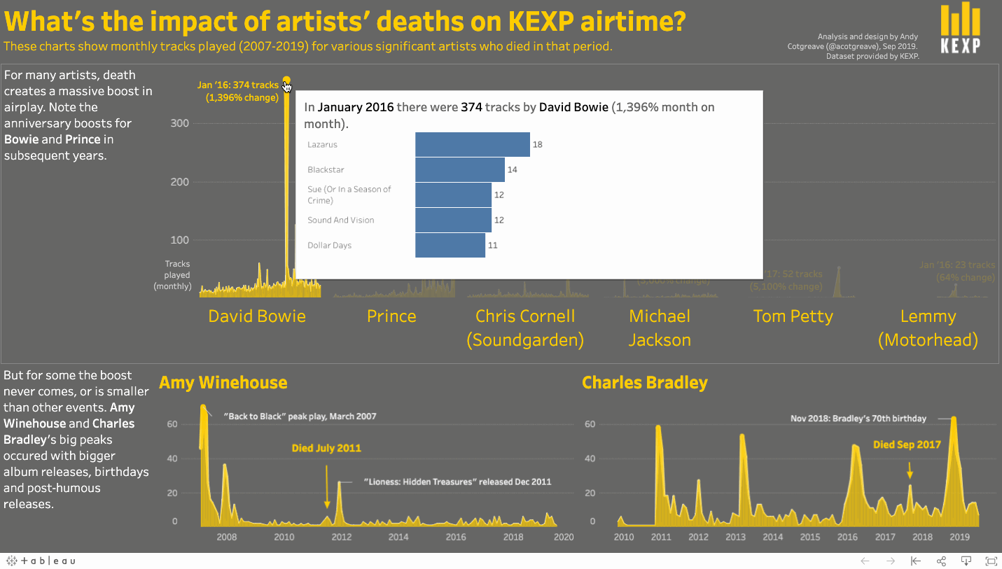 This viz explores how an artist’s death has affected how often their songs are played on KEXP.