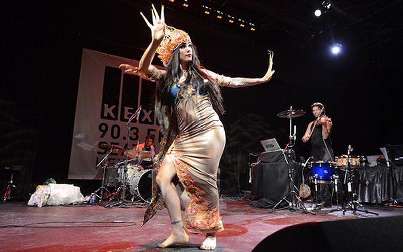 Given the number of groups to perform at the Bumbershoot music festival and to pass through the KEXP halls, you’d think we’d seen everything. Well, it still comes as a surprise to see a band featuring a belly dancer balancing a jug on her bejeweled brunette head while doing the splits. And that is just what we got from the Oakland-based Beats Antique at their Music Lounge show. The performance art mixed with sultry violins, music samples and pulsing percussion provided a provocative and elegant experience for the on-looking audience. Later in the show, there were costume changes involving long metallic fingernails and a crown ta boot! Check the whole thing out for yourself... and watch out for the giant squid!