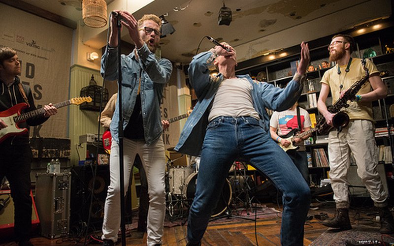 Next on KEXP live from KEX Hostel at Iceland Airwaves was an insane set from Icelandic band Grísalappalísa. The band, whose name means "pig-legged Lisa," plays raucus music that genre-jumps like nothing I've ever seen before. Vocalists Gunnar Ragnarsson and Baldur Baldursson scream and grunt, with accompaniment ranging from punk, to psychadelic, to Kraut Rock--an energetic show, to say the least.They began with "Allt Má (Má Út)," which alternated between yelling, rapping, and dub-esque beats. Gunnar Ragnarsson grabbed the spotlight in a big way with his crazy dance moves, almost mowing over co-vocalist Baldur Baldursson in the process. Next was "Lóan Er Komin" which fell somewhere between post-hardcore and indie rock, but with a distorted saxophone. Ragnarsson took the show outside the bounds of the stage, jumping and falling into the crowd to get them riled up for the rest of the show to come.