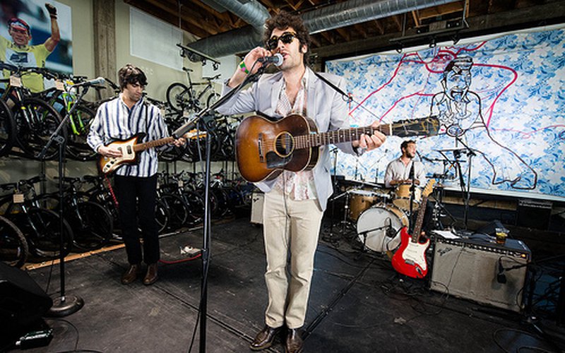 As the second band on our broadcast from Mellow Johnny's Bike Shop during SXSW Allah-las went on in near silence, choosing to omit the banter in favor of guitar riffs, adjustments, and exchanged glances. Composed and with sunglasses on they launched into "Don't You Forget It," and allowing it to melt right into the next tracks - "Tell Me What's on Your Mind," "I Had it All," and "Catalina." Gravely vocals rose up through soft oo's and ahh's, lending the lyrics the melancholy distant feel their self-titled album had - special emphasis on the "had" in "I had it all" felt dreamy and wending on the stage. Almost at the end they broke into their instrumental track "Sacred Sands" that allowed them to demonstrate just how tight of a group they were - the track wove and winded but never came unraveled or dull. They left the stage to cries of more - and pleased grins on both the audiences and the bands faces.