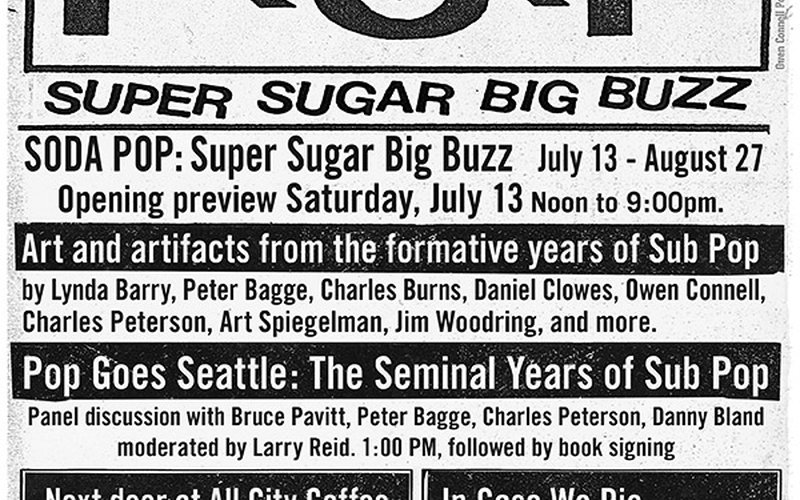 Curated by local legend Larry Reid and Sub Pop co-founder Bruce Pavitt, the exhibit SODA POP: Super Sugar Big Buzz focuses on the formative years of Sub Pop as a hand-crafted zine, cassette label, and column in Seattle music monthly The Rocket. The exhibit will feature artifacts by artists Lynda Barry, Peter Bagge, Charles Burns, Daniel Clowes, Owen Connell, Charles Peterson, Art Spiegelman, Jim Woodring, and more.