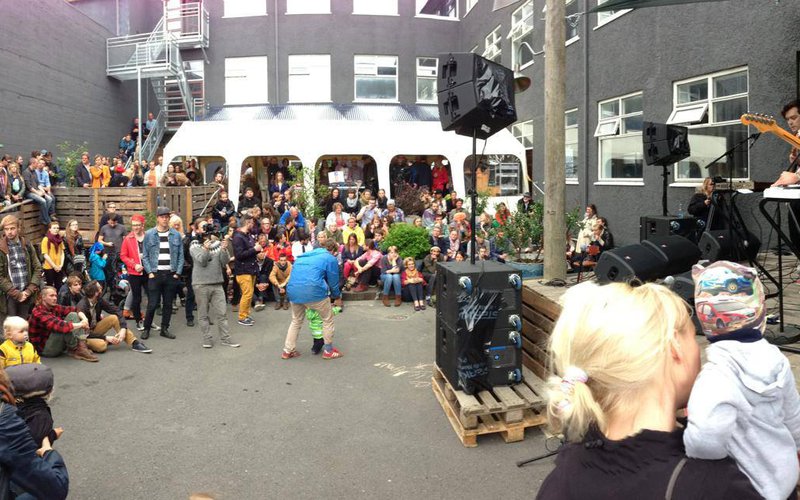 One of the first bands KEXP ever recorded in Iceland, Hjaltalín is a national treasure. Because of their unique blend of rock, folk, chamber pop, classical, electronica, and at times musical theater, it's almost impossible to compare them to any band in the U.S., and it's difficult to judge how listeners here might react. However, KEX Hostel's back patio was filled with fans of the band who produced one of the most critically lauded albums in Iceland in 2012. And they were hardly deterred when the rain began to break. The moment of the entire day: everyone joining in on "Feels Like Sugar" and at the moment we sing "And it feels like sugar, but tastes like rain", a pool of water gathered in the tarp overhead pours theatrically onto the stage.