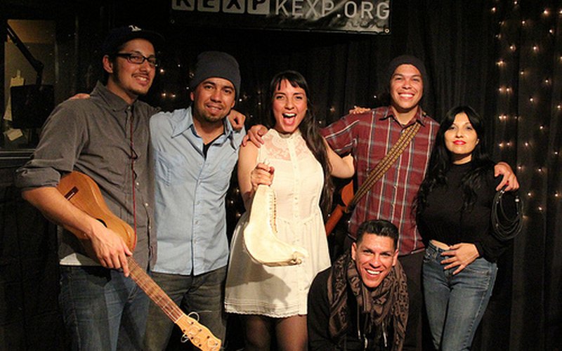 The Los Angeles band, Las Cafeteras, named themselves after a community space in El Sereno, L.A. where group members met one another and started to learn and play Son Jarocho music together, influenced by regional Mexican folk music. The band feminized the name to honor women, they note. Modern day storytellers, Las Cafeteras play songs about the working class, songs about former slaves, songs about the Civil Rights Movement – they even wrote a version of Ritchie Valens’ “La Bamba”, where they infused original lyrics with the aim of promoting positivity and inspiration to eclectic audiences. The band, who rushed to the KEXP studios, losing track of one of their instruments at the airport in the process, played a lively set on El Sonido with DJ Chilly. Watch them here: