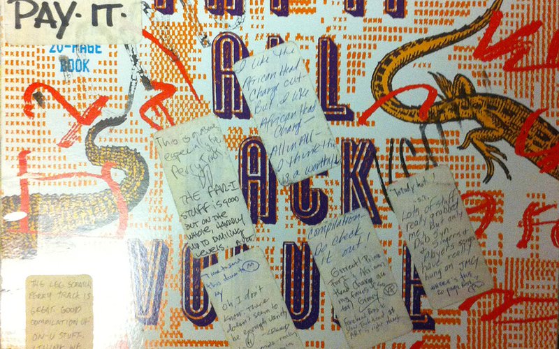 On-U Sound is a record label based in England since 1979, focusing on dub music in its many forms - or at least some of its many forms - from Lee Scratch Perry to label founder Adrian Sherwood's own work. Compilations have always been a great way for labels to give the world a taste of what they have to offer, and from 1984 to 1996 On-U made good use of this approach with their Pay It All Back series. Judging by the mostly enthusiastic reaction of the KCMU DJs, this strategy seems to have been a smart one. (Some overly enthusiastic soul even seems to have stolen the 20 page book advertised on the cover.)