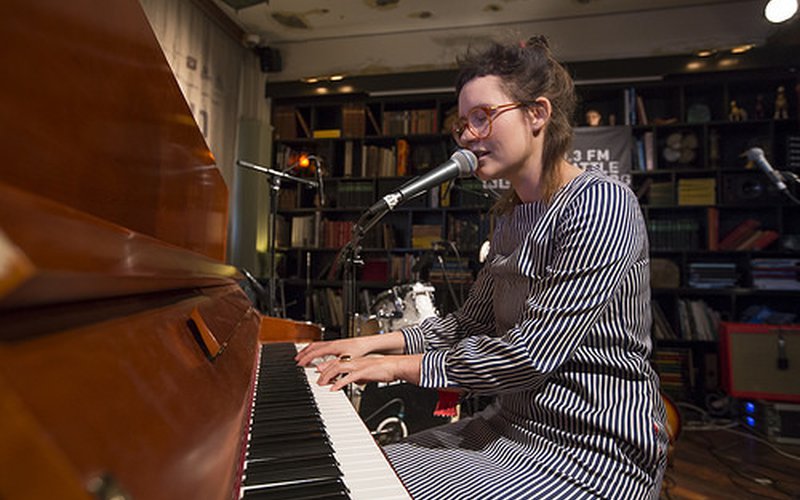 Opening the third day of KEXP’s broadcast live from Kex Hostel at Iceland Airwaves Music Festival was Icelandic singer-songwriter and KEXP favorite Sóley. Previously a member of Seabear and Sin Fang, the soft-voiced multi-instrumentalist has had a very successful solo career. She released her debut We Sink in 2011, and has mesmerized audiences internationally with her delicate, dark, and sometimes downright spooky songs. Her new record, Ask The Deep (Morr Music), continues the tradition of macabre themes established in We Sink with songs like “Ævintýr” (“Adventure” in Icelandic) which describes the true story of a Brazilian man being buried alive.