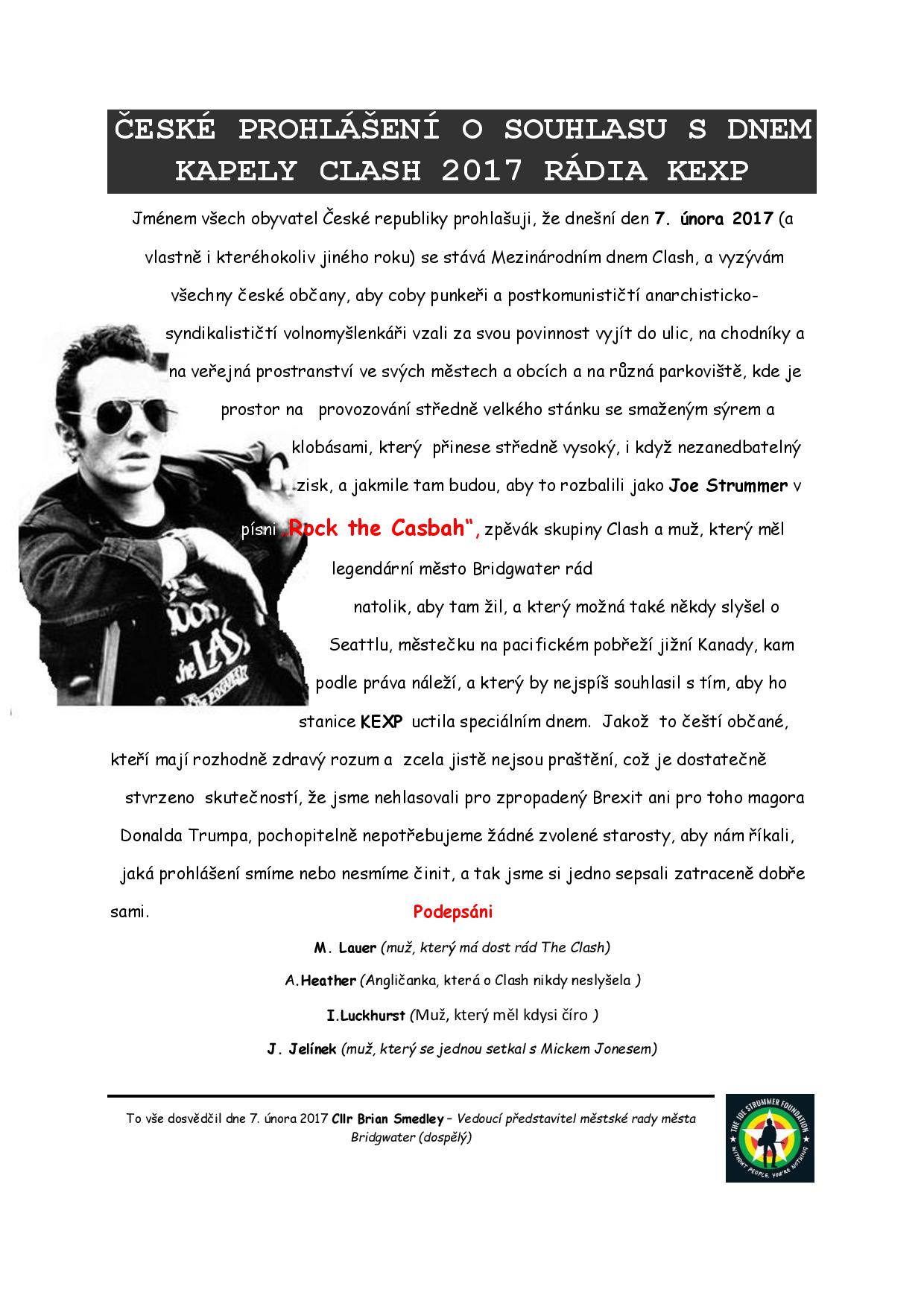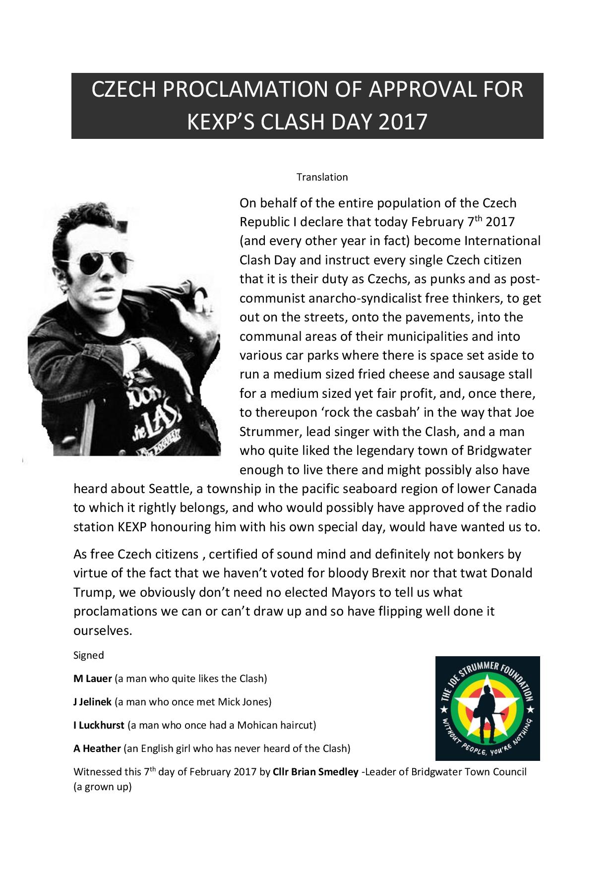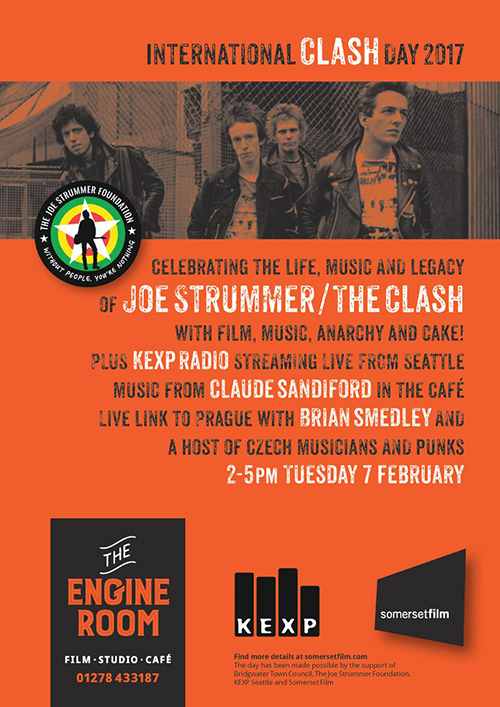 • Bridgwater, UK: From 2 PM 'til 5 PM, visitors can enjoy Clash music and images in the Engine Room café in Bridgwater High Street with a live link to the KEXP radio station in Seattle. There will be live music in the cafe from Claude Sandiford plus a video link to Prague, from where the Leader of Bridgwater Town Council Brian Smedley will be joining in together with Czech musicians and Clash fans.