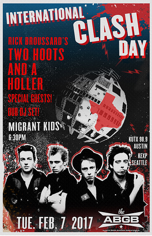 • Austin, TX: Celebrate International Clash Day with KUTX 98.9 at The ABGB [Austin Beer Garden Brewing Co.] starting at 6:30 PM, with Rick Broussard's Two Hoots and a Holler, Migrant Kids, a dub DJ set, and special guests.