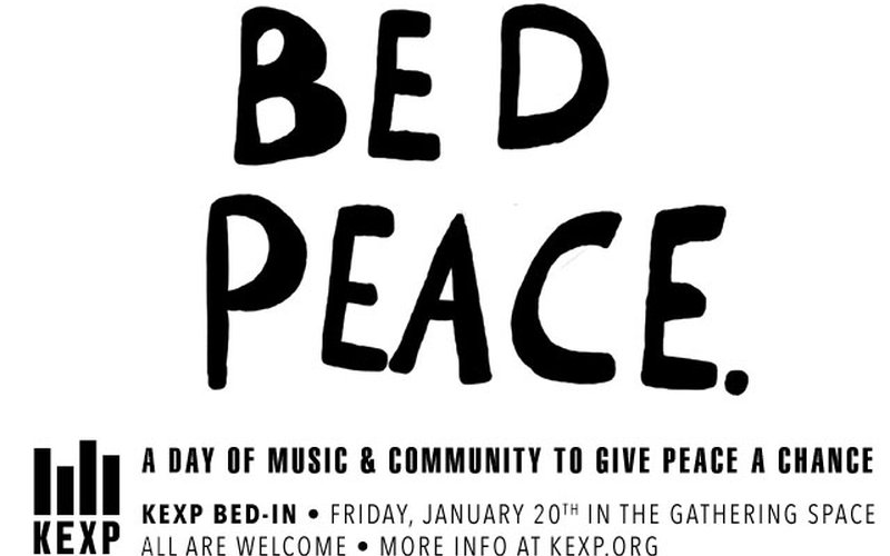 Join KEXP on Friday, January 20th as we come together as a community in the Gathering Space for a Bed-In for Peace. Starting at 8:00 AM, we'll have live music from local artists Wimps, Tomo Nakayama, DoNormaal, Grace Love, and Gabriel Teodros culminating in a sing-along of "Give Peace a Chance" led by Sean Nelson at 9:00 AM. KEXP DJ Riz will MC the proceedings. Everyone from all cultures and communities is invited to join us for this event. Representatives from fellow non-profits Planned Parenthood, The Vera Project, ACLU of Washington, TeenTix, Gender Justice League, Central District Forum for Arts & Ideas, and Office of Arts and Culture will be on site with more information about their respective organizations. They'll also be on the air throughout the week; see the schedule below: