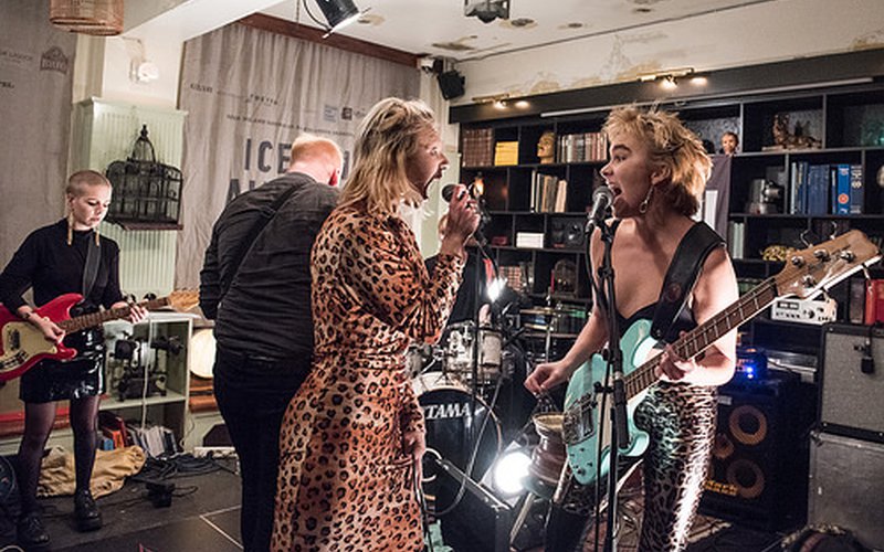 Frontwomen Brynhildur Karlsdóttir and Urður Bergsdóttir—clad all in leopard print and fiery energy—made it feel more like CBGB in the 70's than a hostel in 2017. They opened with "Hamskipti" which quickly moves slow, doomy, and rhythmic into super loud, emotive, high-intensity screaming, letting everyone know from the beginning that they shouldn't get too comfortable. Brynhildur was exploding with power that left her trying to catch her breath at the end of the song. The energy in the room was high right from the start, the crowd enthralled with every shriek and every note. The good vibes were mutual, with Brynhildur joking at one point that the audience was so good they wanted to hire us to be their audience for the rest of airwaves.