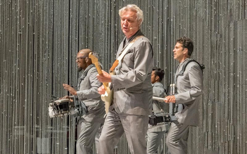Byrne's Paramount set began with him sitting alone at a table, clad in a grey-brown suit, a model of a brain sitting before him, streams of light rising around the stage, as he sang American Utopia highlight "Here." The crowd, thoroughly excited all performance long, intermittently burst with applause as more musicians joined Byrne on stage, starting with Chris Giarmo and Simi Stone, who acted as combination backup singers and Greek choir. By the end of the song, he had been joined by percussionists, bass, guitar, and keyboard. Grown Backwards's "Lazy" followed, one of several Byrne solo cuts that felt invigorated by a live re-interpretation. The 12-piece band was constantly in motion, different musicians stepping to the front of the stage, Byrne moving about like a mad scientist or circus ringmaster. This movement was perfectly blocked out so every member of the production stayed visible. A joyous rendition of Fear of Music's Talking Heads classic "I Zimbra" came next, the polyrhythms and communal energy of the song mirrored by an ecstatic reception from the crowd, who stood dancing. "Slippery People," originally on Speaking in Tongues kept the energy pulsing, the lyrics for which gained additional power with a call-and-response between Byrne and the other performers. "Slippery People" was previously a highlight of Stop Making Sense, the classic Talking Heads concert film, the quality of which was matched by the new arrangement.