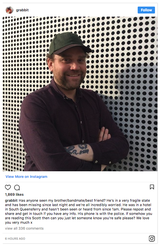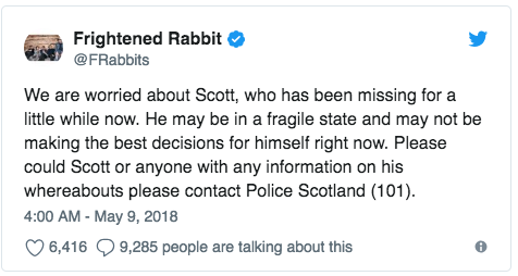 Scott Hutchison, vocalist and guitarist for Frightened Rabbit, has not been seen since this morning, 1:00 AM Scottish Time, as he left the Dakota Hotel in South Queensferry. He is believed to be in a fragile state, and police in the city are appealing for information on his whereabouts. The BBC reports he was last seen wearing “a dark baseball cap, navy blue hooded jacket, grey or khaki trousers and white trainers.”