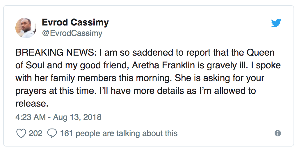 On Sunday, August 12th, news came out via an exclusive with entertainment website Showbiz 411 that the Queen of Soul was "gravely ill" and was surrounded by friends and family at a hospital in Detroit. It is reported, the family is asking for prayers and privacy during this time. Evrod Cassimy, a WDIV Morning News Anchor in Detroit and personal friend of Franklin's, confirms the news.