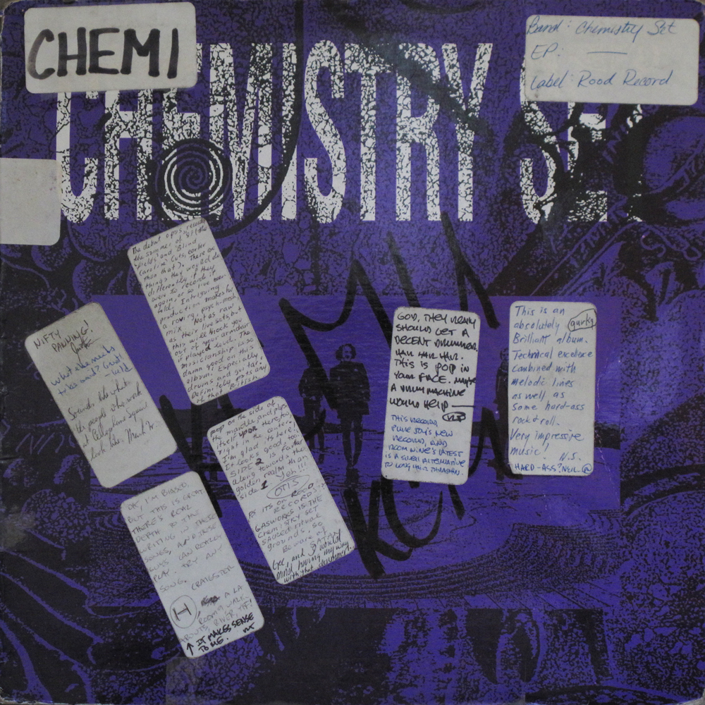 This week we have one of those situations where the hand-written DJ comments on this album cover will become perhaps a significant portion of — if not the only — primary source on the internet about a given band or release — and I'm feeling the weight of that responsibility, so I don't want to mess anything up. Chemistry Set was a band in Seattle. They appeared on the much-celebrated Sub Pop 200, released an EP and a single, and then went their separate ways. The personnel on this EP — at least according to Discogs — were Scott Sutherland, Scott Vanderpool, Brian Learned, and Tom Ewers (some of whom went on to such bands as the Green Pajamas, Llama, Whitey, and more). Based on the two songs I was able to find on Youtube — and the voluminous comments you're about to read — they made really cool and interesting music. And that's about all I feel qualified to say, so let's let the people who were there do the rest of the talking:
