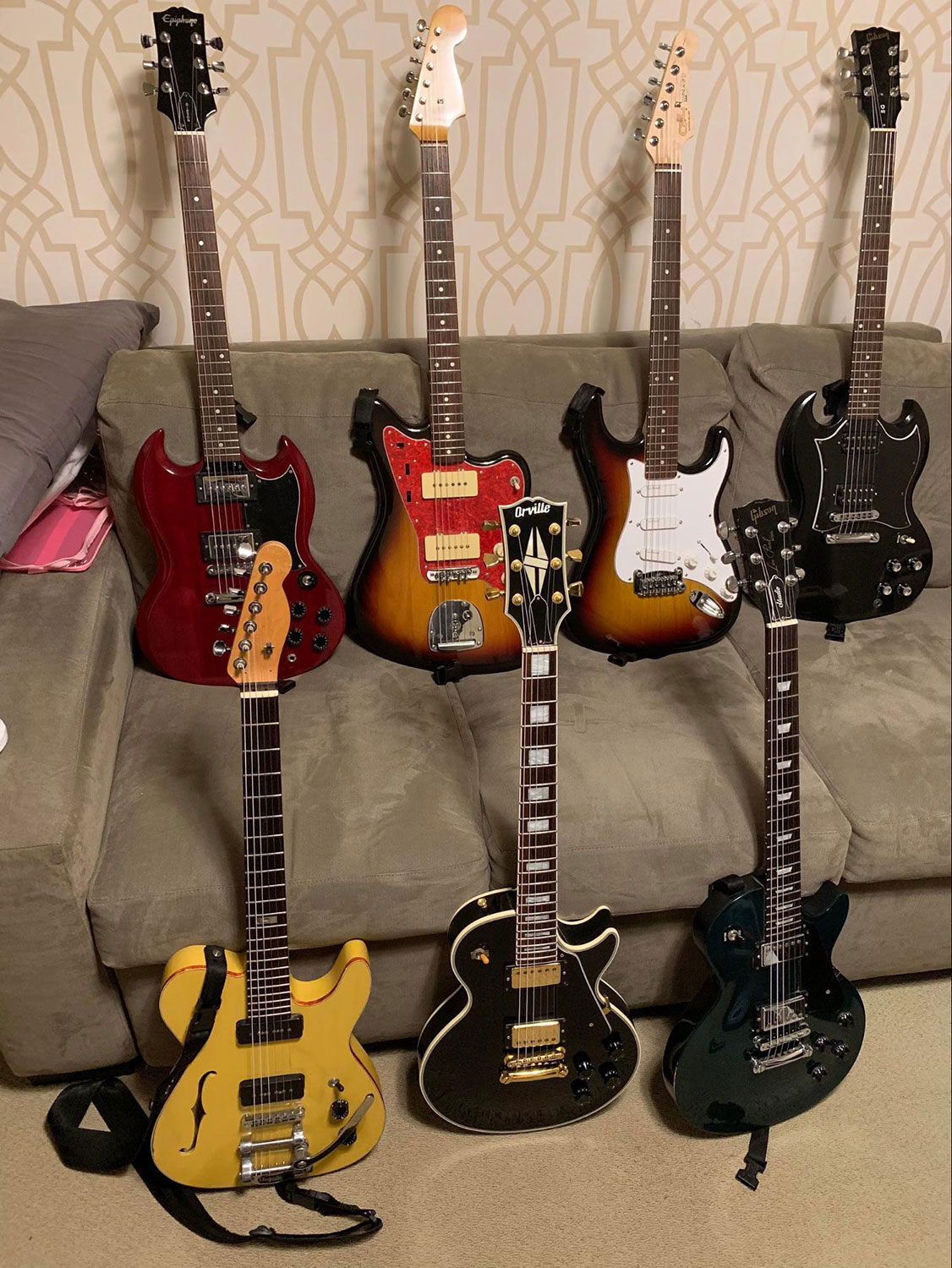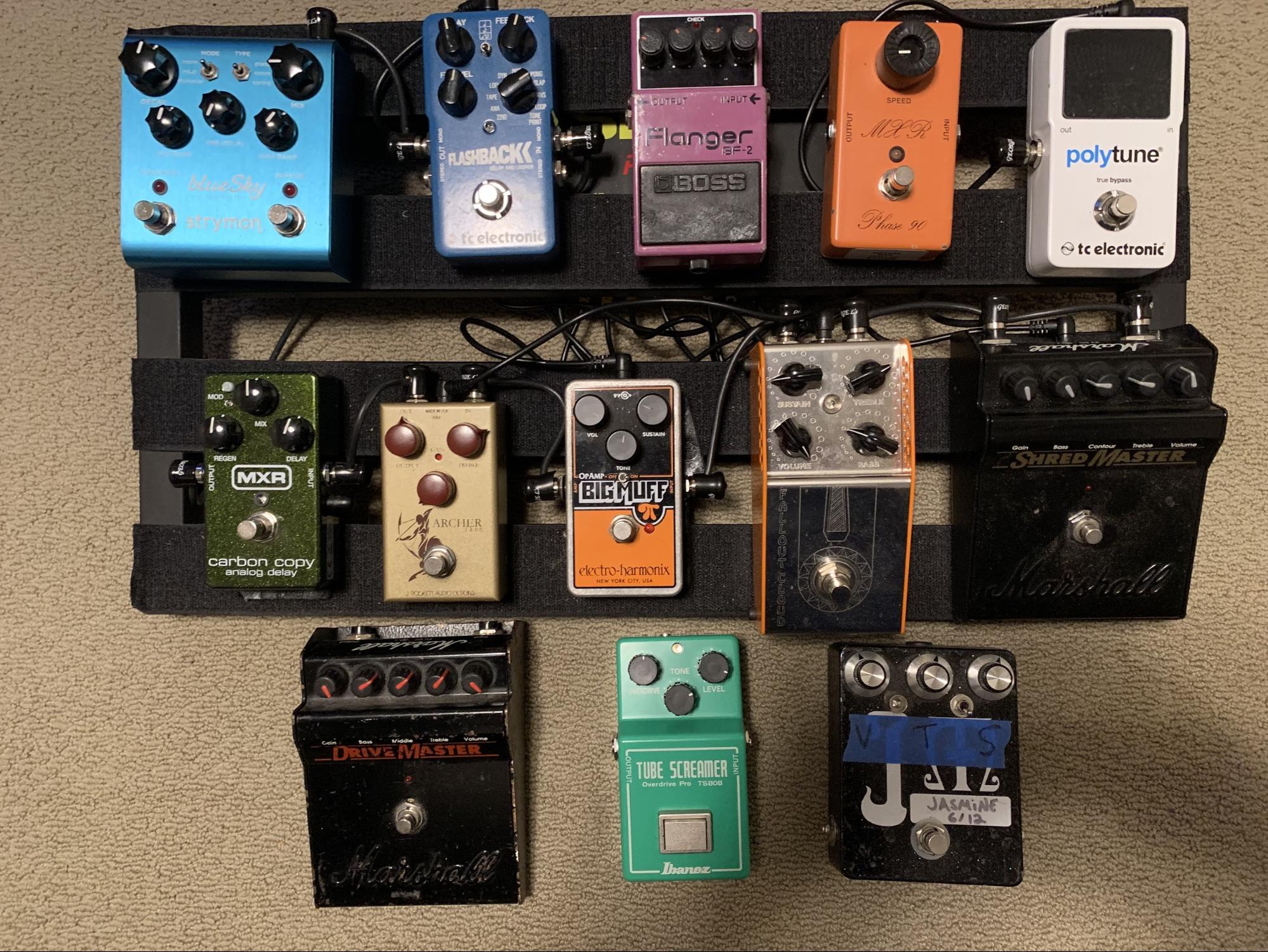 For me, the most fun and interesting aspect of playing with pedals is the effect that different combinations of pedals have on the overall sound of my guitar. If there’s anything unique about my board, it’s that over half of the pedals I use are different types of distortion/fuzz, and I often have more than one running. The other thing I like about the pedals I use is that they’re all pretty simple and straightforward to use, which is especially helpful if/when I hear something I want or don’t want while playing live or at practice. I also like that I bought most of my pedals used, and that I’m not afraid to leave the house with some super expensive/vintage/breakable pedal.