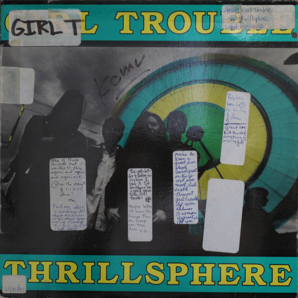 This week brings us Girl Trouble's second LP, Thrillsphere, a delightfully entertaining slab o' wax that had (most of) the KCMU DJ crew boppin' in their seats - at least, as far as I can tell from the comments. Just a glance at the album credits reveals that this is a perfect little slice of 1990 Seattle (okay, Tacoma) rock history: released by PopLlama records, recorded at Egg studios by Steve Fisk . . . oh, and there's a song called "Coffee Mama." I'm sold.