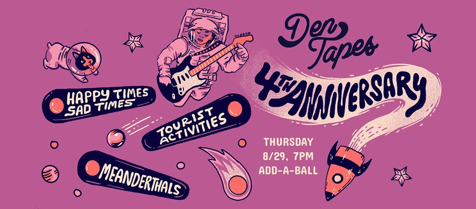 In 2016, Willy Walker and Dan Spaulding (of the band Porn Bloopers) joined Kay at Den Tapes. Somehow, through some independent cosmic fate, Kay (from Dallas), Willy (from Olympia), and Dan (from Brookings, SD) all moved to Seattle about seven years ago. Willy and Dan joined Kay after Porn Bloopers released an album on Den Tapes and they realized it was a great way to kill time, plus be able to support their friends. One presidential term later and they’re celebrating their fourth anniversary on Aug. 29 by throwing a patio show at (essentially) their second, La-Z-Boy living room, Add-a-Ball, Fremont’s arcade and pinball paradise. Amping the patio later tonight will be the Den Tapes’ hitmakers Tourist Activities, Meanderthals, and Happy Times Sad Times.