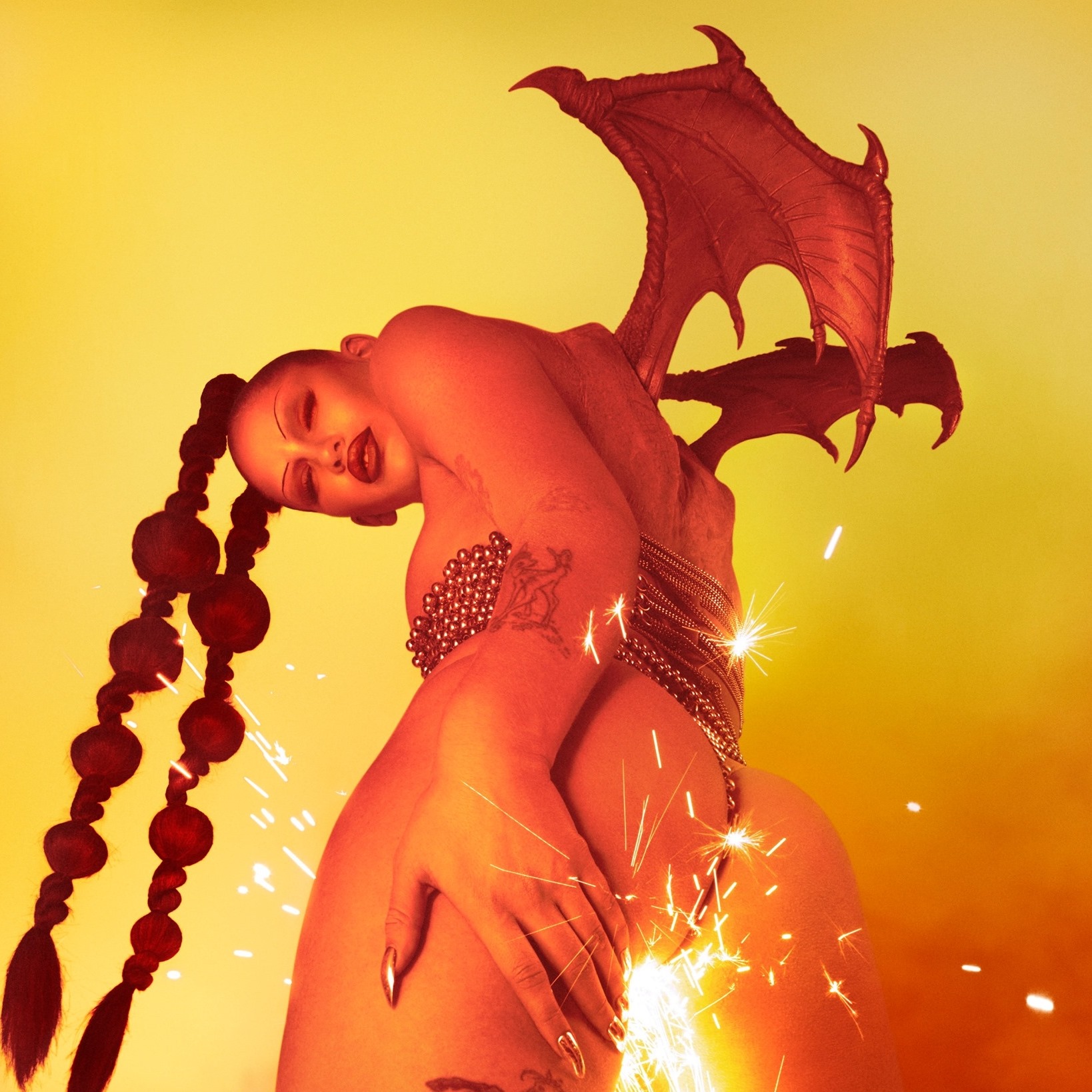 In her lyrics, too, Eartheater explores paradox. She wrestles with romance and temptation as essential to the human experience, yet she acknowledges their interference with personal ambition and the search for purpose (“Abandoning my dream and mission / For a fantasy collision” and “You and I don’t need to be more than just right now / But just right now could steal a lifetime / So I’m inclined to break away”). While seemingly escaping this particular romance for artistic liberation, she still embraces the play between the two. In “Volcano,” what she describes as the album’s central peak, and the following “Fantasy Collision,” she vividly demonstrates that the merging of bodies can ignite the fire from where an individual is reborn. “A phoenix rising / From the ashes / I return / To where I belong.”
