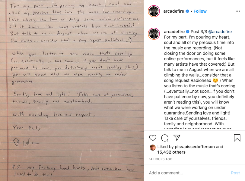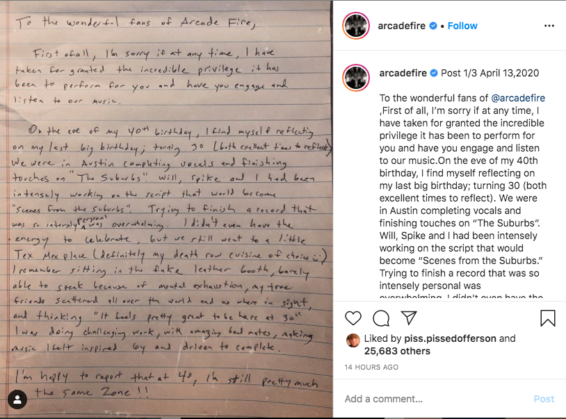 Milestone birthdays are a good time for reflection as Arcade Fire frontman Win Butler demonstrates. When he turned 30, Butler and band were finishing up their award-winning album The Suburbs. Today, as he turns 40, he confirms that, despite the coronavirus, the band are working on their next LP. He writes: