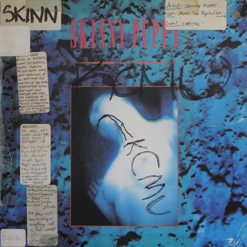 It seems Skinny Puppy couldn't get much respect at KCMU in the '80s. Some loved their first full-length, Bites, but it seemed everybody hated Cleanse, Fold, and Manipulate. Between those two releases, we had their second album, with the provocative (and Tipper Gore-baiting) title Mind: The Perpetual Intercourse. And, you know, I get it. If I had been a college DJ in the mid-'80s (or even when I was actually in college, a decade or so later), my eyes would have rolled out of my head just at that title alone. But I do wish the KCMU crew had spent a bit more time with this album and this band. Still, at least one person seemed to think they weren't bad enough not to play? Hey, airplay is airplay, right?