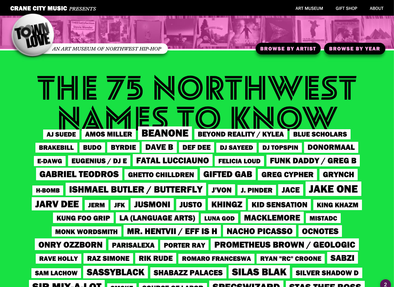 The database spans over 40 years and allows readers and viewers to browse by both artist and year. My favorite thing to do is select a year at random and dig into all the stuff I hadn’t heard of. Whether you’re a neophyte or an expert, Town Love is a tremendous resource for anyone wanting to dig a little (or a lot) deeper into Seattle rap music.