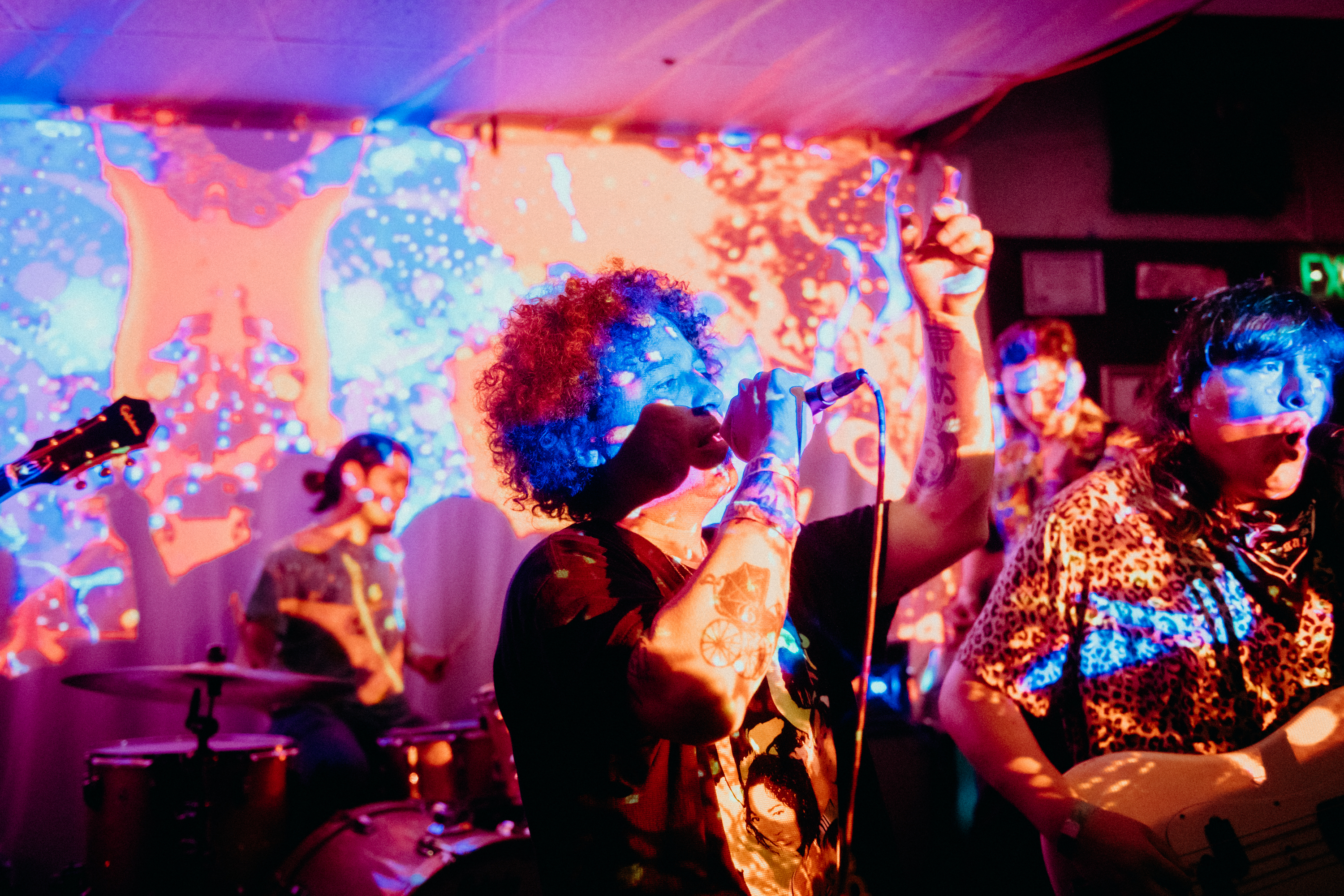 I sloshed through the soggy streets of Ballard, hopping from venue to venue. I allowed scorching guitars to melt my face in the depths of a Pacific Northwest autumn, one of the bleakest seasons an American can survive year after year. Plenty haven’t survived them, but this is not about our fallen friends and heroes. This is about the ones who have, who have stretched well past 4pm sunsets and spent their nights packed into rock clubs too small for the noise bouncing around its walls. Who shared cigarettes, small talk, and scene gossip outside of Salmon Bay Eagles Club and looked at the projections reflecting off of musicians with dazed, bleary eyes inside. The people who jumped into their tight jeans, slipped into miniskirts over their thickest leggings, and gained five pounds of muscle putting on their Doc Martens night after night. All of us who headbanged in agreement to Acid Tongue’s “The World’s Gonna Fuck You.”