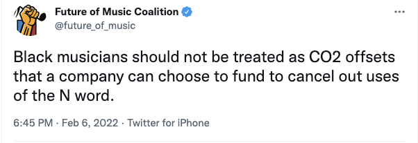 KEXP: You tweeted on the Future of Music Coalition's Twitter that Black musicians should not be treated as carbon offsets to all of this fallout. Tell me more about your reaction to this latest news.