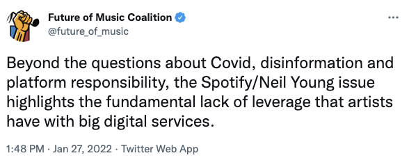 I think that's actually where the disinformation piece and the artist royalties piece, as well as the racist content piece, all sort of come together. Spotify is so big and so powerful that they can really resist accountability, some of the normal forms of accountability that musicians would otherwise be able to have. In a healthy, functional music marketplace, artists could choose. I'm not comfortable with this. I'm going to withdraw my catalog and I'm going to go somewhere else with it. In a marketplace where Spotify has such a dominant role, it becomes really difficult to, whether financially or because you're dependent on Spotify's access to audiences with their large market share. You could be dependent on Spotify for the metrics, because some booking agencies and venues make their booking decisions based on how many Spotify plays you have. Withdrawing your catalogs as a small, independent artist is a move that can be a really, really difficult call to make, that may not even be available. And that's before you even get into the questions about whether an artist is legally able to do that. A lot of musicians do not own their own sound recording rights. They work with a label, and so the label is ultimately the one that is going to be able to make the call about whether whether it goes on the platform or not. You know, Neil has a great relationship with Warner [Bros. Records], and Warner was able to abide by his wishes. Other labels may not be able to be as accommodating. In fact, dependent on licensing agreements that they signed, they might not be able to fulfill an artist's wishes even if they wanted to.