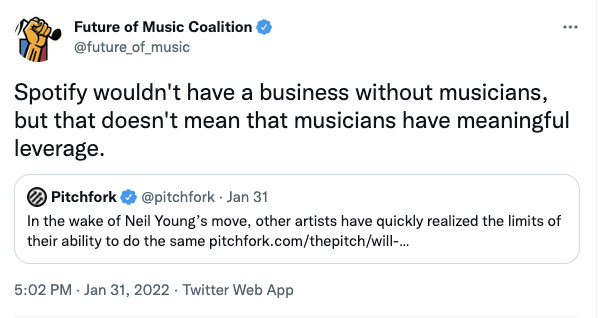I also saw that you were tweeting about how there's a lack of leverage artists have with big digital services. We're seeing these these big artists be able to make a stand, but these are people that don't necessarily need Spotify for income. I've talked to many independent artists who are like, "yeah, I'd love to pull my music from Spotify, but like then I just become irrelevant in the streaming era." I'm curious where indie artists fall in this whole thing as well.